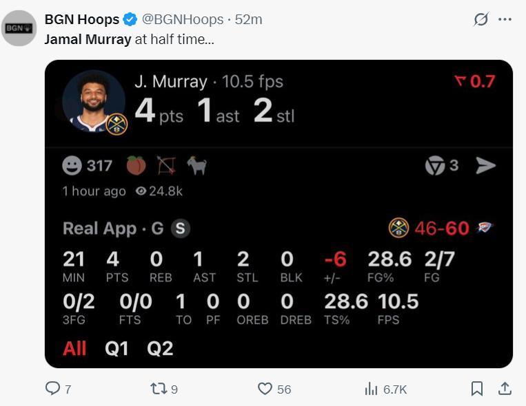 整個上半場掘金的進攻都是由約基奇在支撐,穆雷首節3中1怒砍2分,次節4中1再怒砍2分,半場穆雷7中2拿4分0籃板1助攻,這樣的表現如何幫助球隊。