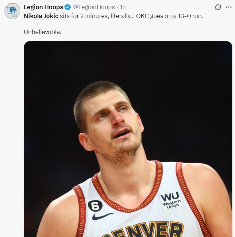 上半場約基奇只休息了2分鐘雷霆打出了13-0的攻勢,第二陣容是各種失誤,上半場約基奇17分6籃板3助攻,此役掘金的板凳不僅沒有奇兵還都是誤攻,約基奇也無能爲力。
