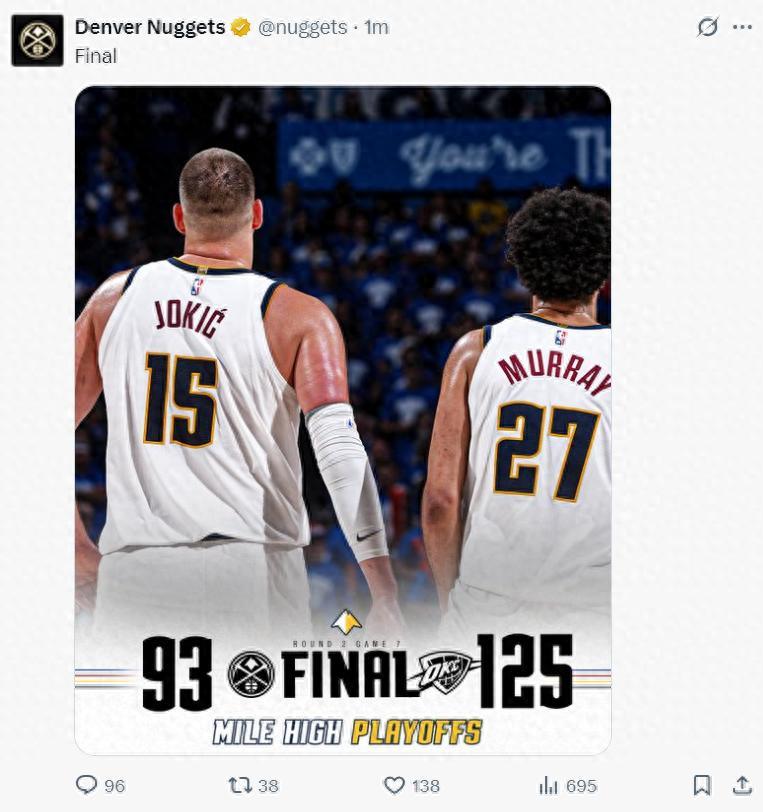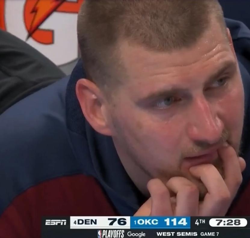北京時間5月19日,掘金以93-125慘敗雷霆,大比分3-4出局。掘金首節短暫領先後第二節直接崩盤,之後第三節與第四節也是崩盤,末節還剩9分36秒阿德爾曼就提前放棄比賽了,約基奇在場下啃手指,這場搶七他9中5拿20+9+7打卡。