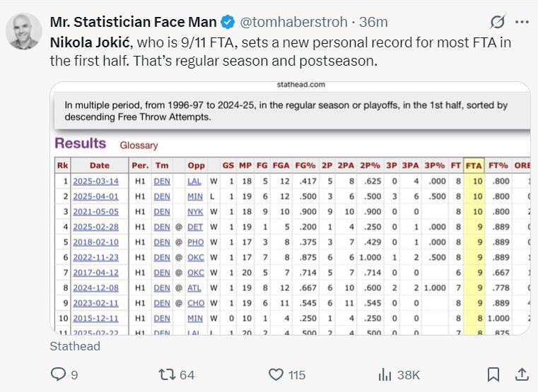 約基奇上半場真的盡力了,他半場就造了11個罰球創造個人職業生涯新高,常規賽+季後賽都是新高,他已經非常努力的衝到雷霆三秒區去肉搏,但掘金還是被雷霆在第二節打崩。