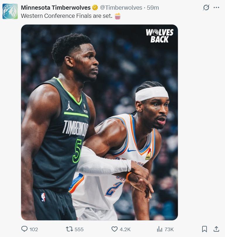 或許NBA真的到了新王登基的時刻,四支進入分區決賽的球隊只有尼克斯隊史有總冠軍(上一次是1973年),其餘的步行者、雷霆、森林狼都沒有總冠軍,只要不是尼克斯奪冠就是新王當立的一年。