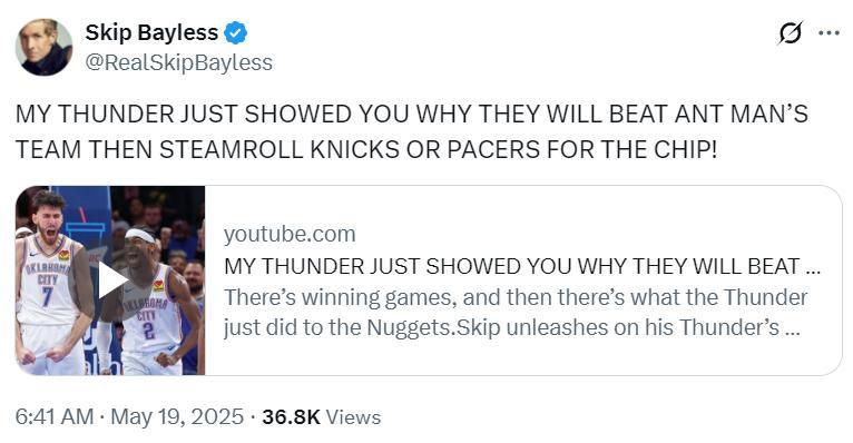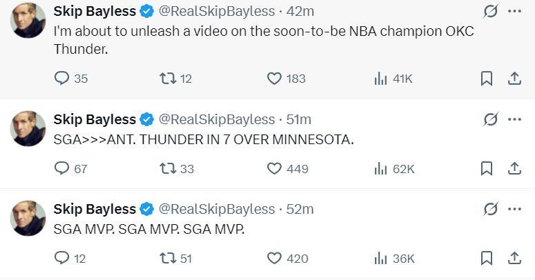 名嘴斯利普-貝勒斯寫道:SGA大於愛德華茲,SGA是MVP,我即將發佈一段爲什麼雷霆會成爲總冠軍的視頻。