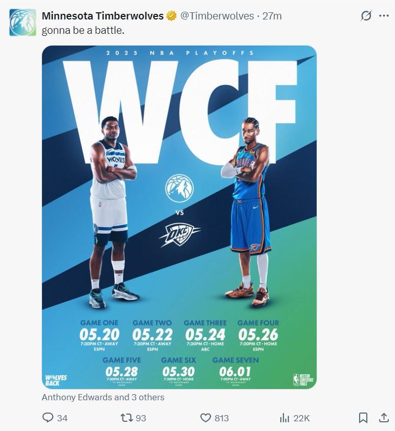 森林狼官方已經曬出與雷霆的賽程宣戰!美國時間5月20日G1、5月22日G2,5月24日G3,5月26日G4,5月28日G5,5月30日G6,6月1日搶七。