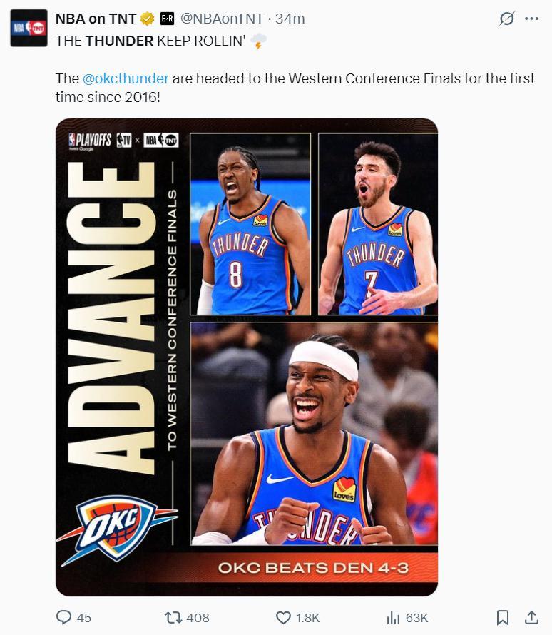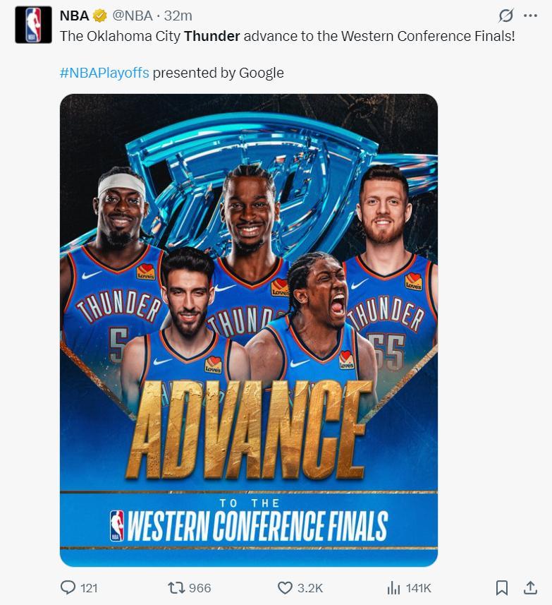 隨後多家美國媒體都發推祝賀雷霆進入分區決賽,這是雷霆隊史自2016年後首次進入分區決賽,算上超音速時期這支球隊合計也只有5次進入分區決賽。