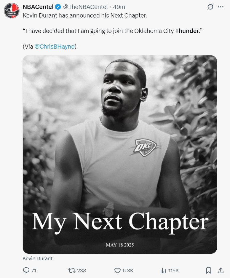 美媒調侃:杜蘭特下一站是俄克拉荷馬雷霆隊,他想要重返OKC。