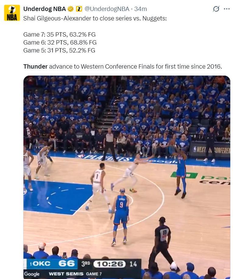 美媒曬出SGA對陣掘金最後三場比賽的數據,搶七35分+命中率63.2%,G6拿32分+命中率68.8%,G5拿31分+命中率52.2%。
