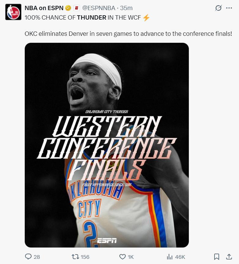 NBA on ESPN官方寫道:在分區決賽中有100%的概率發生雷電風暴,因爲OKC晉級了西決。