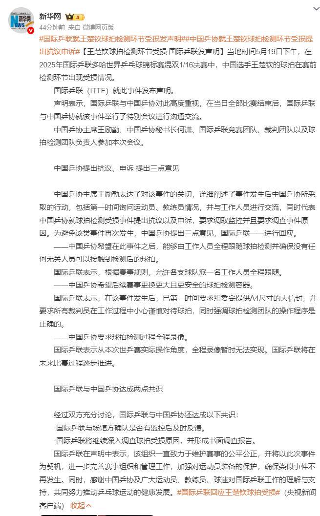 2.國際乒聯將繼續深入調查球拍受損原因,並形成書面調查報告;