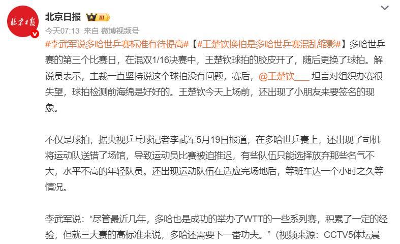 中國乒乓球隊的隨隊記者李武軍還透露:多哈世乒賽還出現大巴司機將運動隊送錯球館,導致運動員比賽被推遲,有些球隊甚至放棄一些不知名的年輕球員。