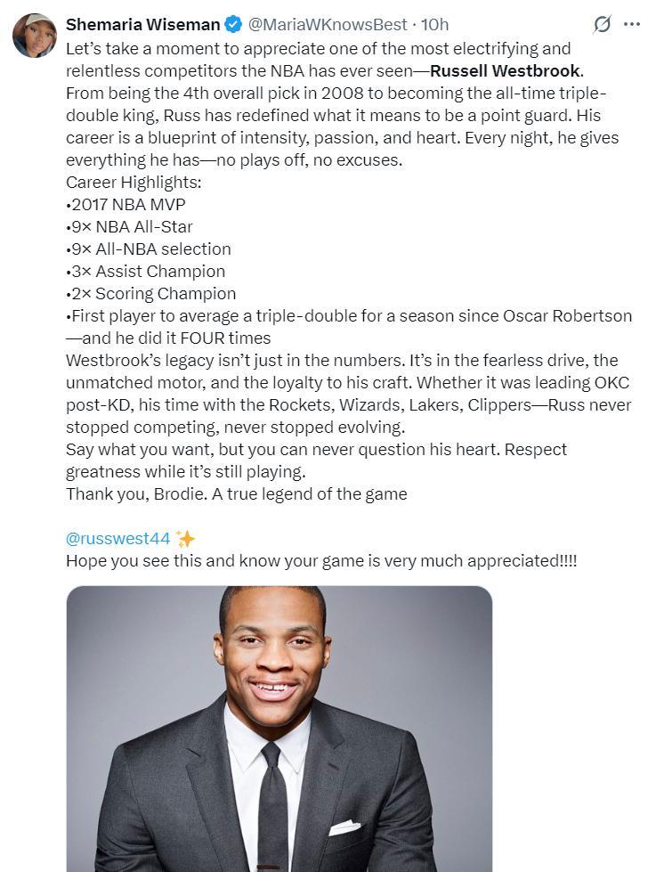 一位威少球迷更是長文致謝龜哥:NBA 歷史上最令人激動、最頑強不屈的競爭者——拉塞爾-威斯布魯克。