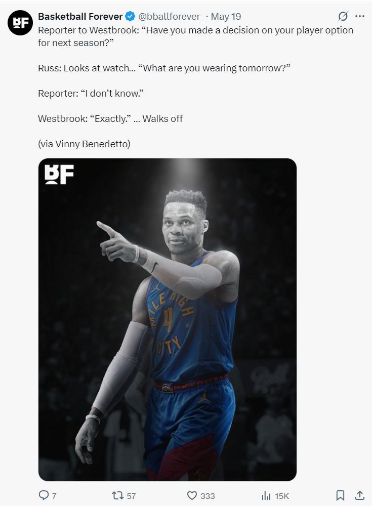 賽後有記者想問威少是否會執行球員選項時,威少問他明天會穿什麼?記者說不知道,威少回覆那不就對了。(威少這是在暗示自己還沒有做決定,他不一定會執行球員選項留在丹佛)