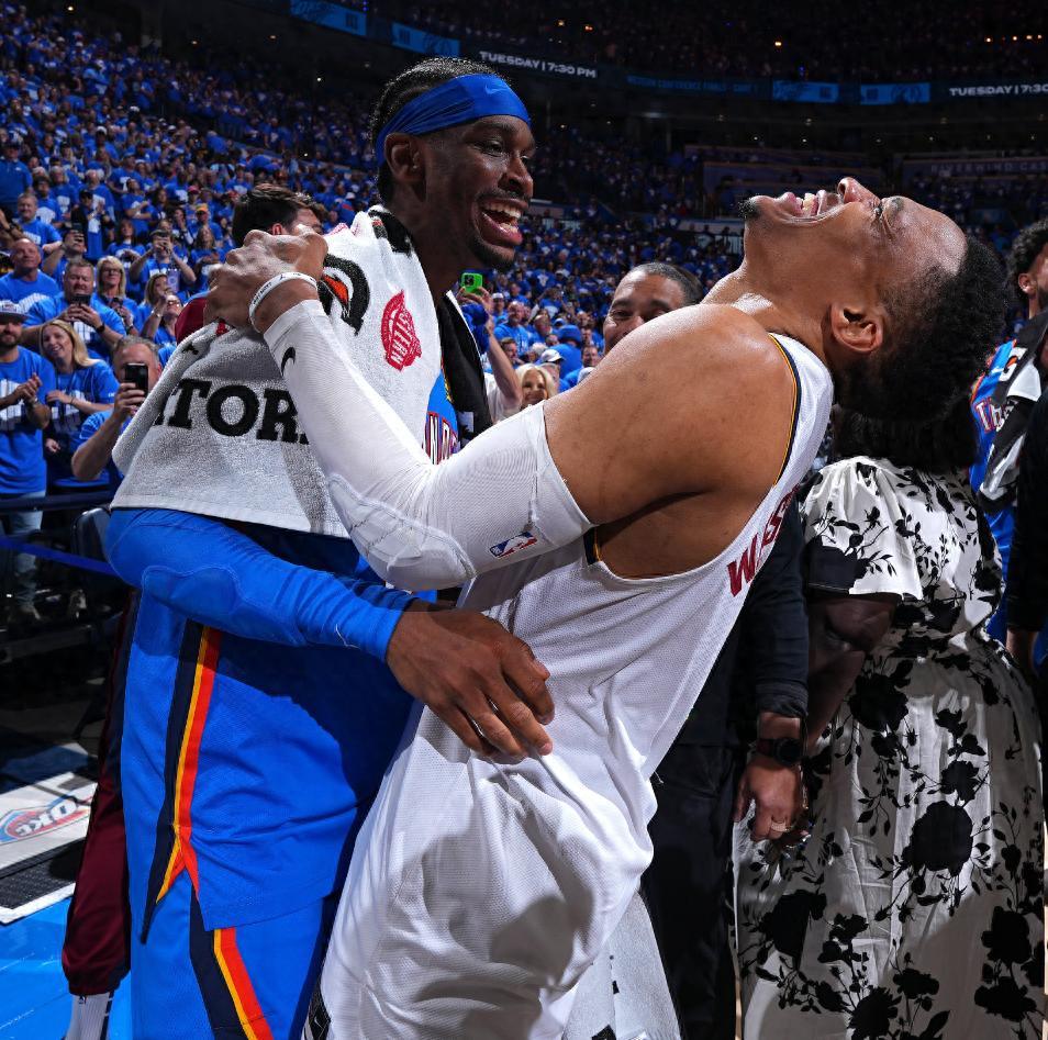 當威少與亞歷山大相擁大笑的那一刻,所有人都夢迴2012年,當時的威少意氣風發,他與杜蘭特、哈登、伊巴卡一同進入分區決賽、總決賽,他深愛着這座城市,他是俄城的圖騰,但這不代表他在丹佛沒有盡全力,這位老將拿着330萬的年薪已經拼盡全力。