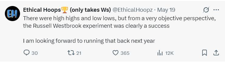 美媒EH寫道:就今年來說掘金引進威少無疑是超值的成功引援,威少在丹佛有高光也有低谷,希望他能執行球員選項回到丹佛。