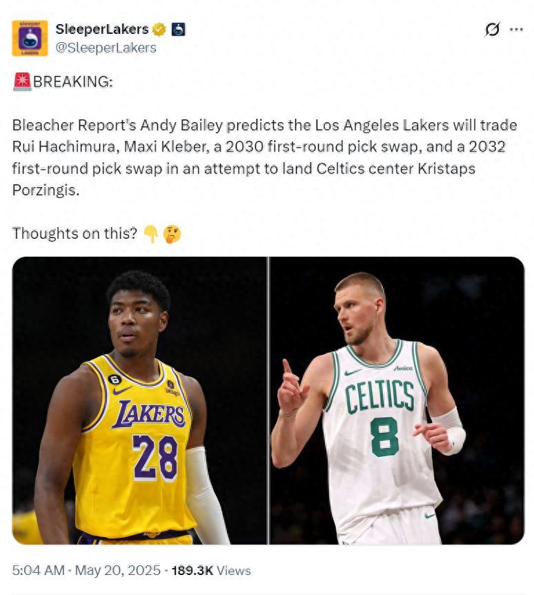 北京時間5月20日,湖人媒體SleeperLakers建議,LAL用八村壘、克勒貝爾、2030年首輪互換權、2032年首輪互換權交易得到克里斯塔-波爾津吉斯。(可以幫助綠凱減輕新賽季的奢侈稅)