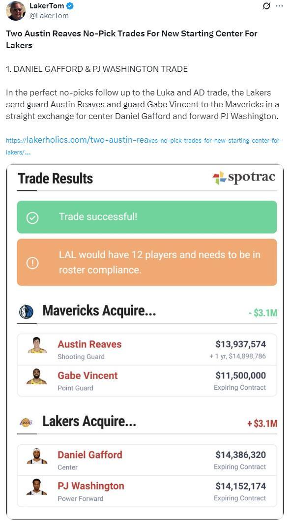 他也發佈了一篇關於湖人不會賤賣裏夫斯的長文,因爲裏夫斯、克內克特是湖人僅有的優質資產,湖人要爲了補強合格輪換纔可能送出裏夫斯、克內克特。