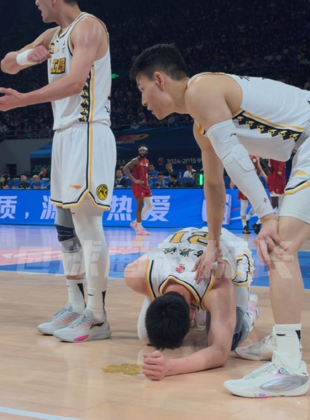 首節開場4分31秒,胡金秋在籃下卡位時疑似被奧莫特頂到了腹部的位置,胡金秋直接捂着腹部倒地嘔吐,從細節圖來看嘔吐物是墨綠色,很有可能是膽汁。胡金秋作爲廣廈男籃最穩的點,4分半就拿到7分,他下場後對廣廈的攻防打擊都很大。
