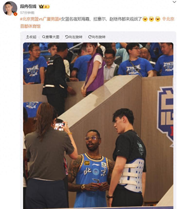 這場總決賽G6吸引了多位籃壇大咖前來,女籃名宿鄭海霞,NBA現役球員丹吉洛-拉塞爾,遼寧男籃核心趙繼偉。北京男籃受傷的曾凡博也戴着護腰在場邊助陣。注意拉塞爾還是身穿北京男籃球衣,他在NBA的道路已經很狹窄,來CBA打球或許是一個新的可能性。