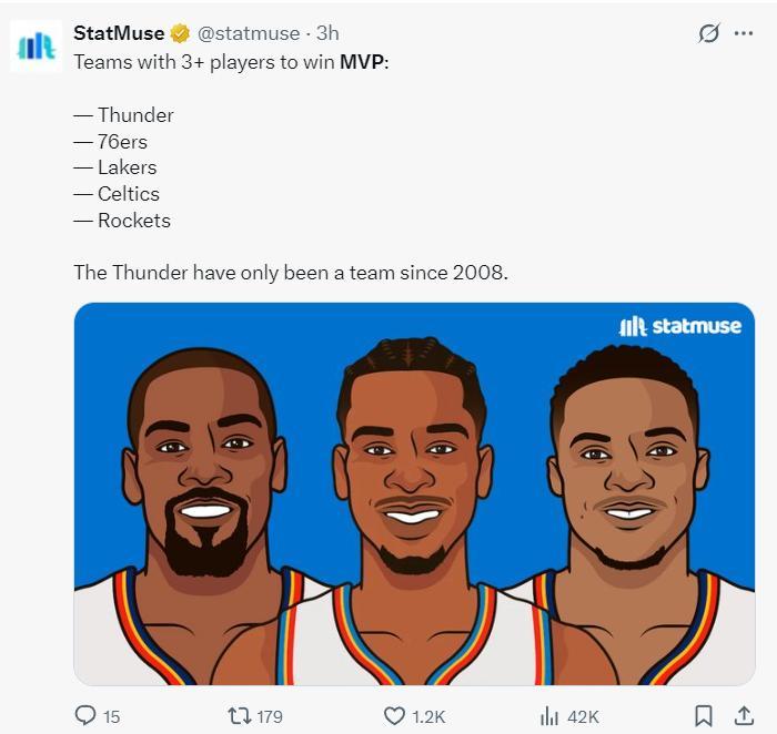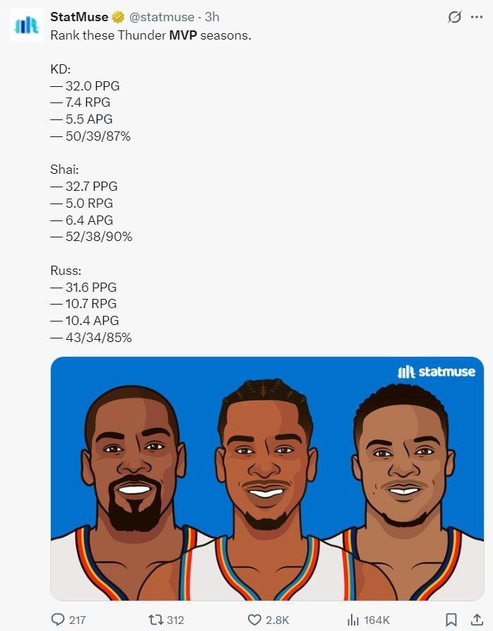 數媒曬出雷霆隊史三位MVP該賽季的數據,杜蘭特場均32+7.4+5.5+50/39/87%;威少31.6+10.7+10.4+43/34/85%;亞歷山大32.7+5+6.4+52/38/90%。