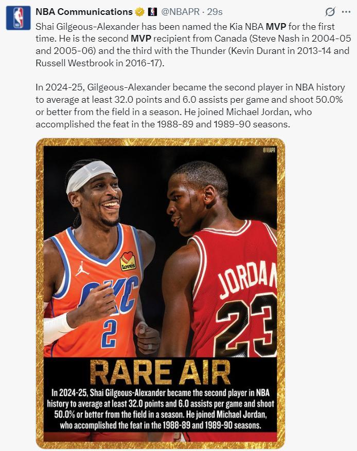 亞歷山大當選MVP也創造多項紀錄:1.他成爲雷霆隊史第三位常規賽MVP;