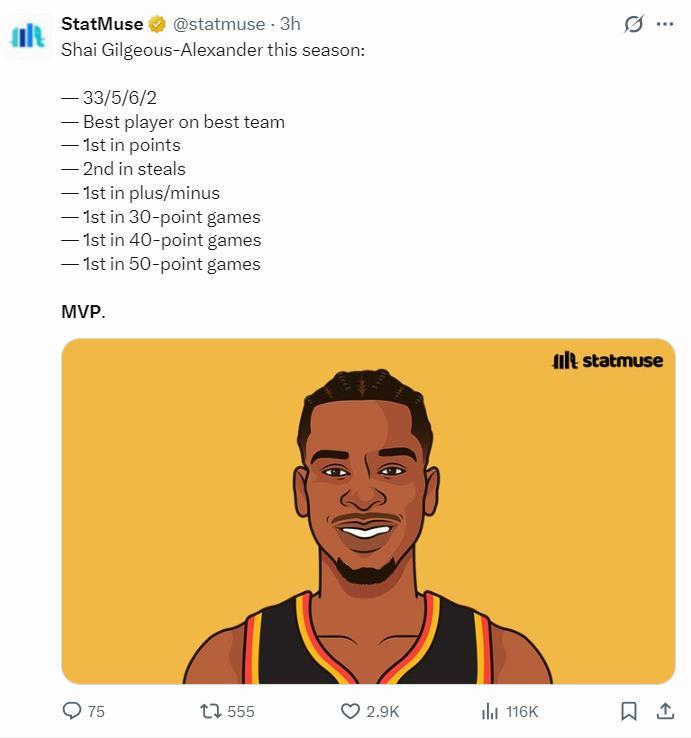 數媒曬出本賽季SGA的數據力挺——場均接近33+5+6+2+1;