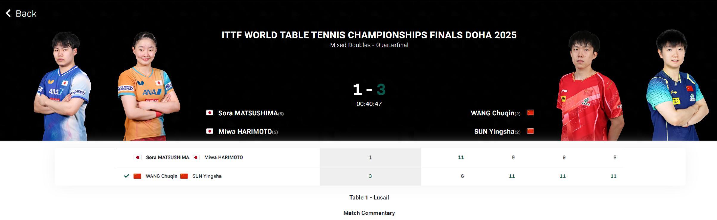 北京時間5月22日,多哈世乒賽混雙1/4決賽,中國組合王楚欽/孫穎莎3-1逆轉日本組合松島輝空/張本美和,四局比分:6-11,11-9,11-9,11-9。這場比賽後16歲的日乒一姐張本美和也吞下了本屆世乒賽的第一場失利。