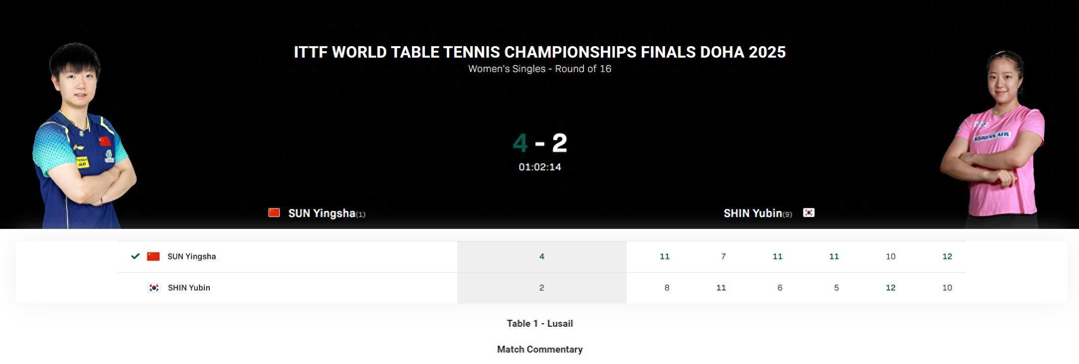 多哈世乒賽女單1/8決賽,國乒一姐孫穎莎4-2擊敗韓乒一姐申裕斌,六局比分:【11-8,7-11,11-6,11-5,10-12,12-10】。這場比賽也是申裕斌在本屆世乒賽上的首次失利,此前的混雙、女雙申裕斌都已經進入半決賽(因爲沒有3-4排位賽至少能拿兩銅)。