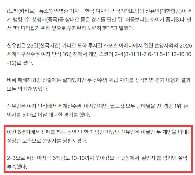 文中更是寫道:21歲的申裕斌此前面對孫穎莎的6場比賽全敗,而且6戰僅贏1局,這七次交手贏了兩局,兩人的差距正在縮小,申裕斌也表示自己會更加努力,爲了趕上世界第一的步伐,這次的失利自己並不後悔,自己已經竭盡全力。