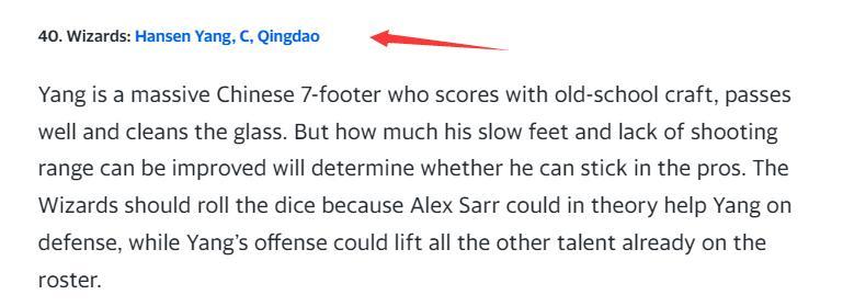 雅虎體育則預測楊瀚森在首輪40順位被奇才隊選中。