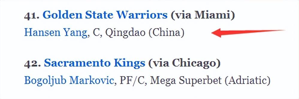 ESPN預測楊瀚森在次輪41順位被金州勇士隊選中。
