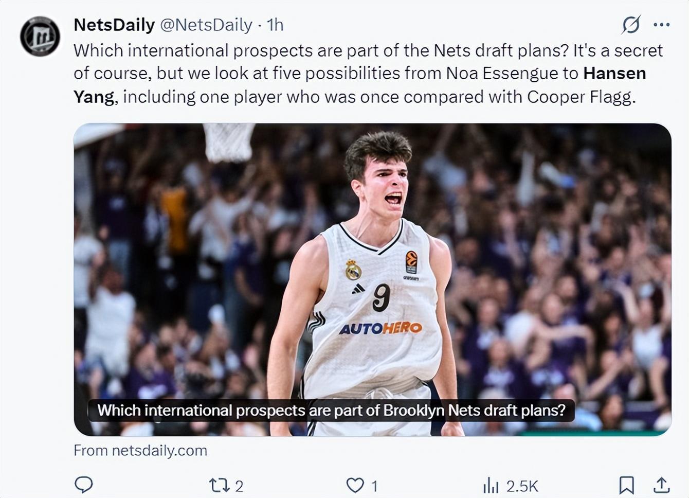 目前手握8、19、26、27、36號籤的籃網已經公開有意楊瀚森。