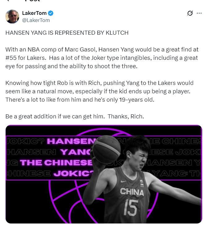 手握55號籤的湖人媒體更是公開招募楊瀚森。