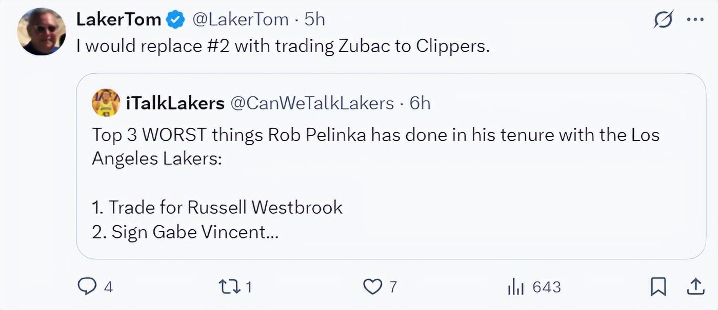 另一湖媒Laker Tom加了第四條:4.將祖巴茨交易到快船換穆斯卡拉;