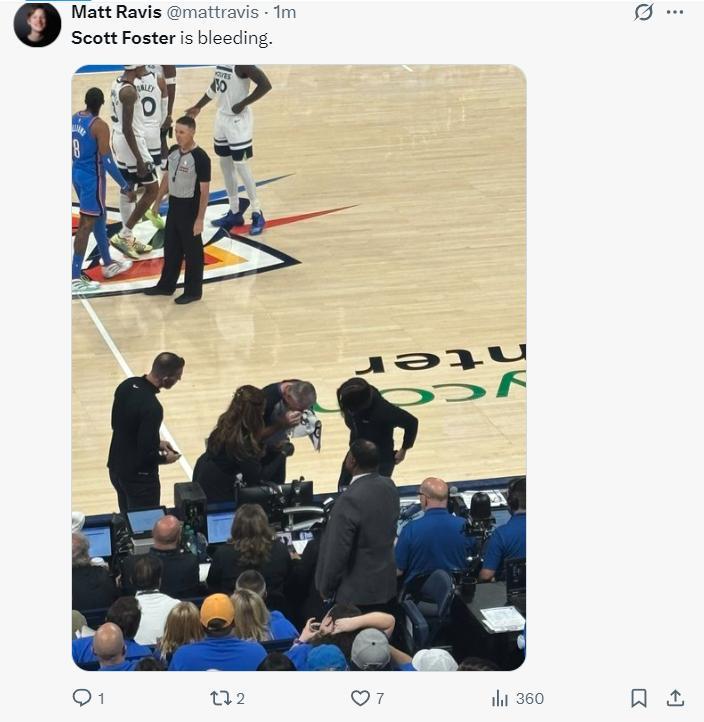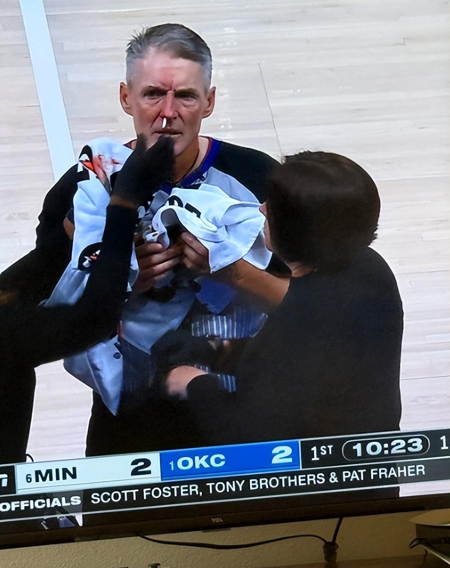 北京時間5月23日,雷霆VS森林狼的西決G2剛剛開場,主裁判斯科特-福斯特滿臉鮮血比賽被迫暫停。從回放來看福斯特是一邊走一邊滴血,地板上都全是他的血,福斯特也示意場館醫生需要進行止血治療。