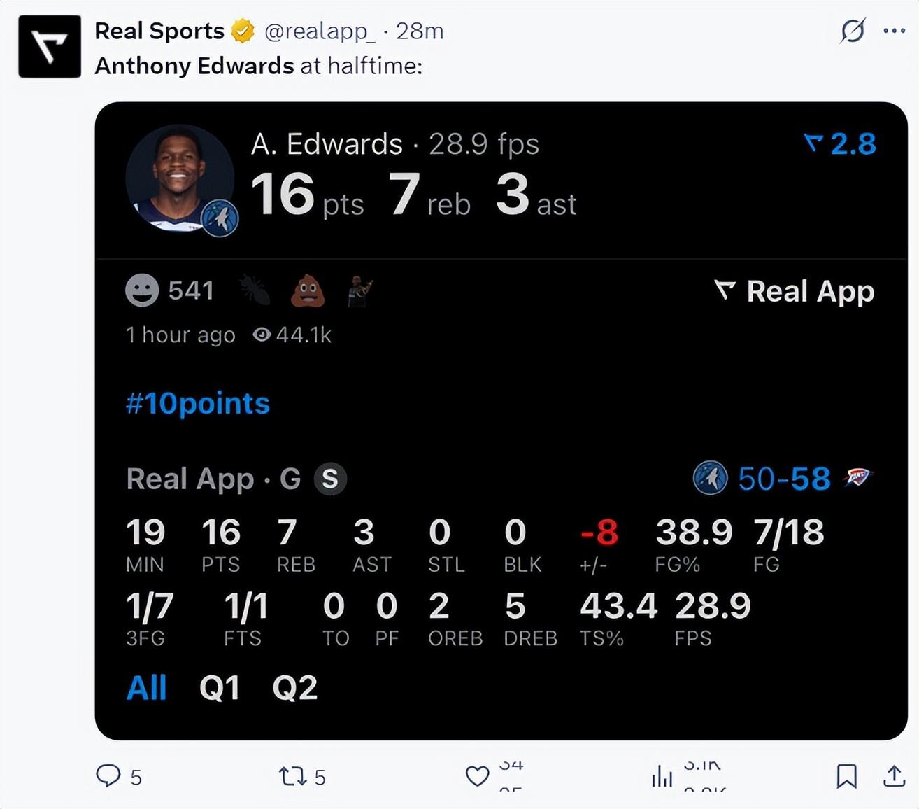 上半場愛德華茲打了19分鐘,18中7,三分7中1,罰球1中1,拿16分7籃板3助攻0失誤,命中率38.9%,真實命中率43.4%,正負值-8。雖然效率不佳但他G1全場比賽才18分。