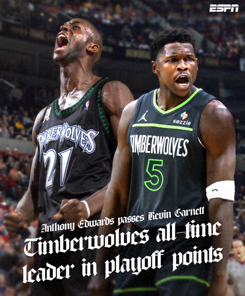 賽前NBA官方就在預熱愛德華茲即將超過加內特季後賽總得分1049分,結束華子只用了三節就來到1051分,唐斯603分第三,麥丹412分第四。不得不說森林狼隊史成色過於薄弱這才讓華子很快成爲木狼季後賽得分榜第一人。