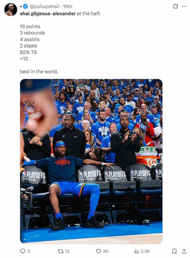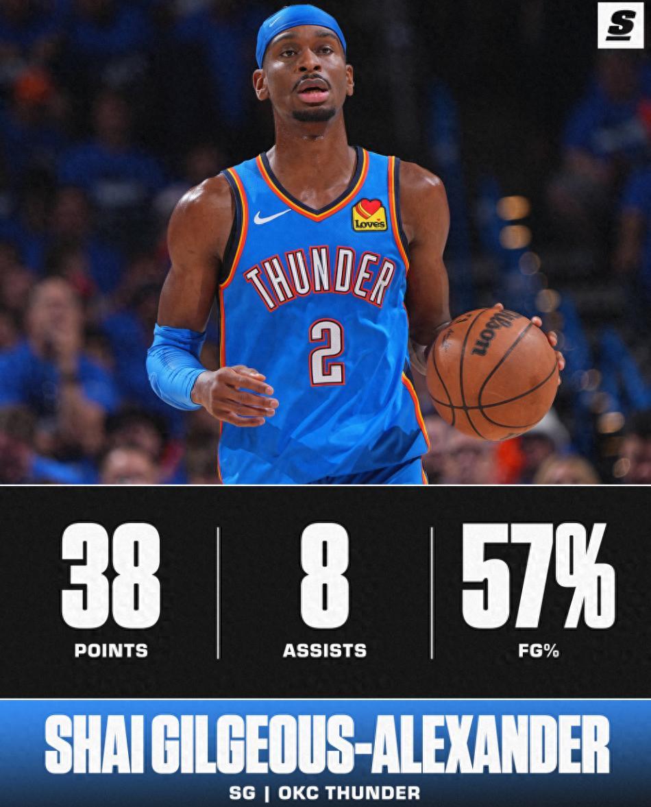 次節SGA還完成了一個高難度的後撤步三分,雷霆也依靠這個三分球將分差拉開到8分,半場SGA拿到19分3籃板4助攻2搶斷,真實命中率82%,正負值+13。