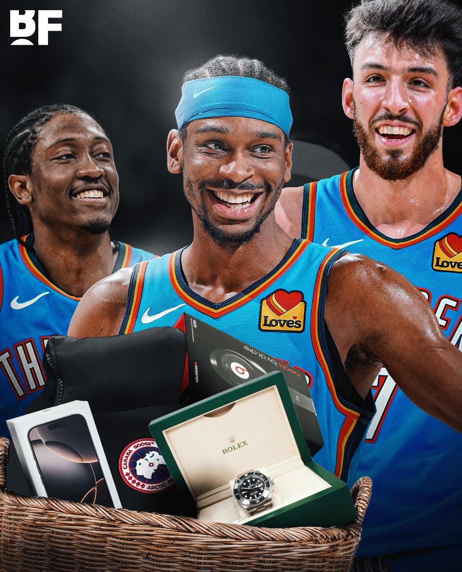 轉播方給到SGA送給隊友們的大禮包,勞力士手錶、iPhone手機、Beats By Dre耳機、定製加拿大鵝羽絨服,總價值超過1萬美元。(全隊的話那就是好幾十萬美元啊,SGA真是大氣的領袖)