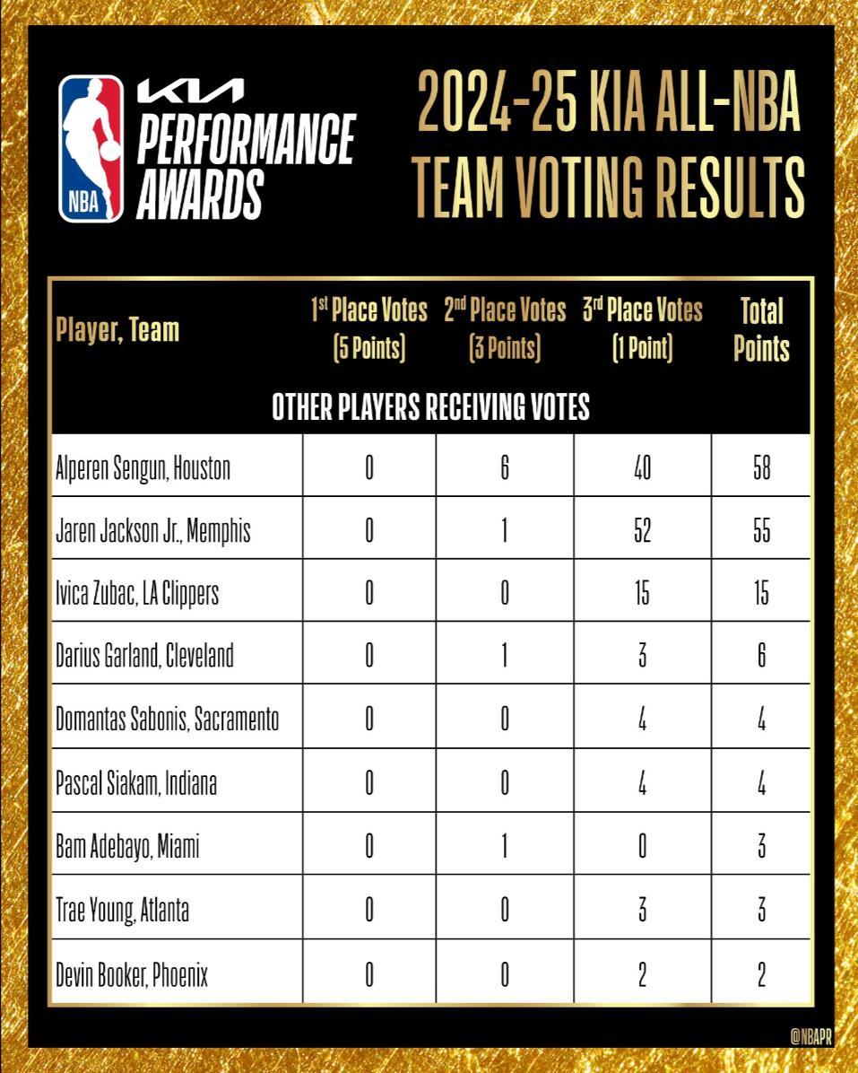 最佳陣容落選的球員中申京6張第二選票,40張第三選票,合計是58分,他只比哈登差10分而已。