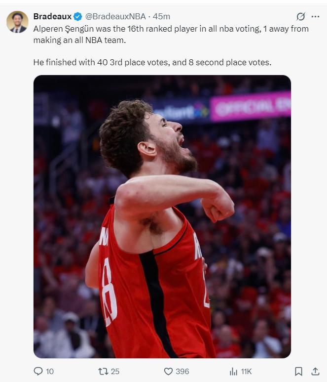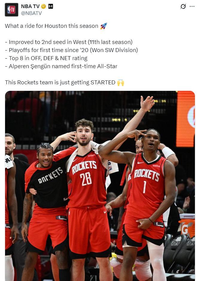 因爲火箭本賽季西部第二(上賽季西部11),自2020年後首次進入季後賽(西南區冠軍),進攻效率+防守效率+淨效率值都是聯盟前八,申京還首次入選全明星陣容。