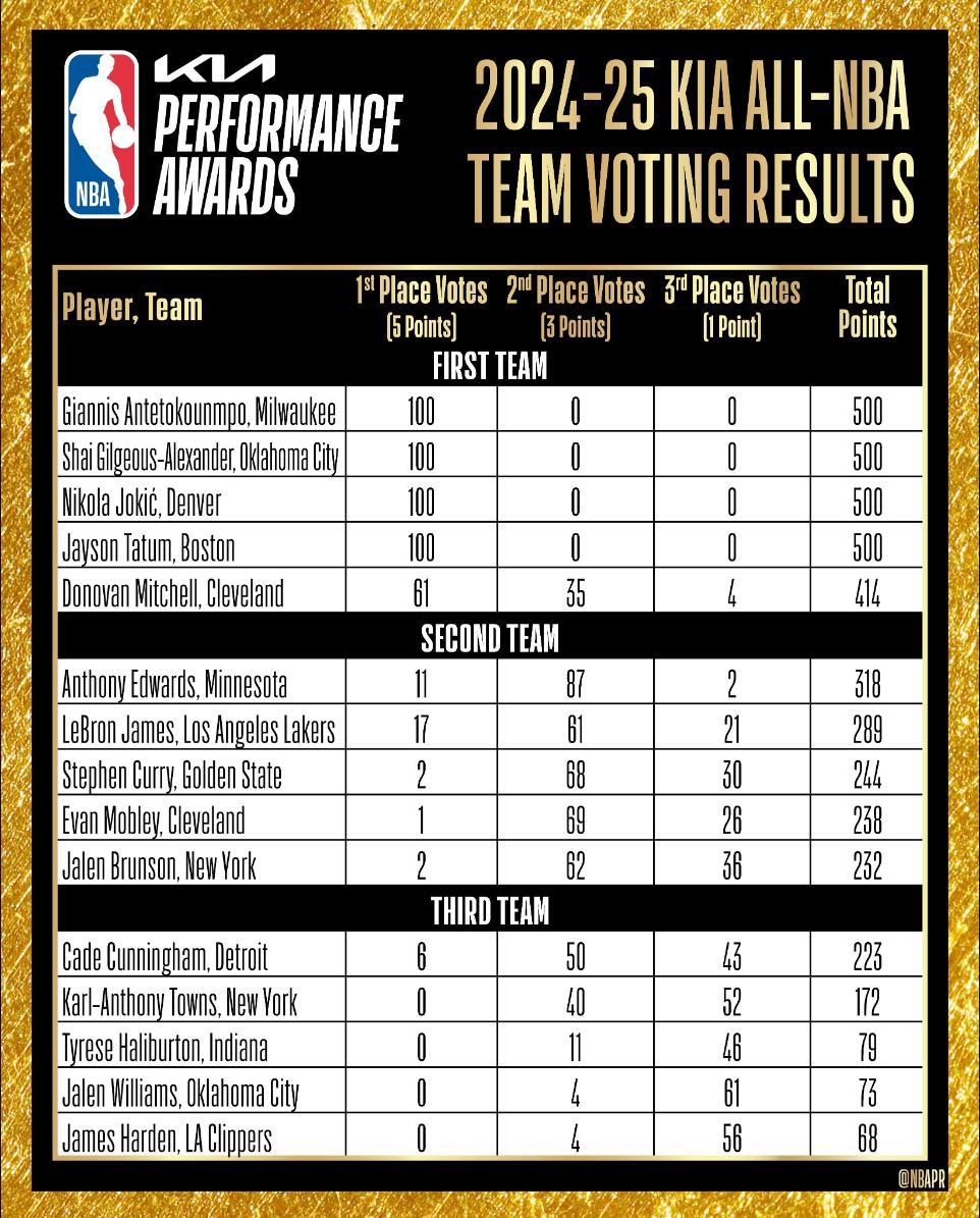 從投票來看,傑威排在三陣的倒數第二,4張第二選票、61張第三選票總分73分,哈登是倒數第一總分68分。(傑威本賽季入選全明星、最佳防守陣容、最佳陣容成爲大贏家)