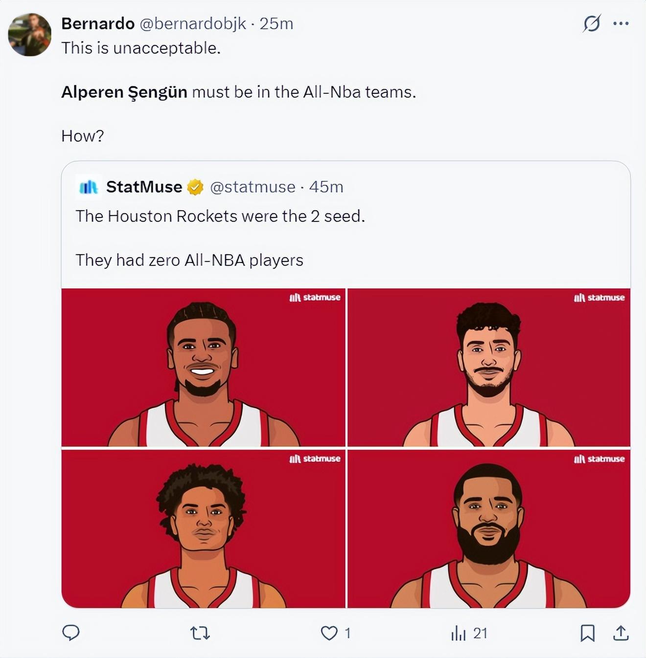 最佳西部第二的火箭一人都沒有入選最佳陣容,火箭球迷發聲認爲申京落選最佳陣容真的很不公平。