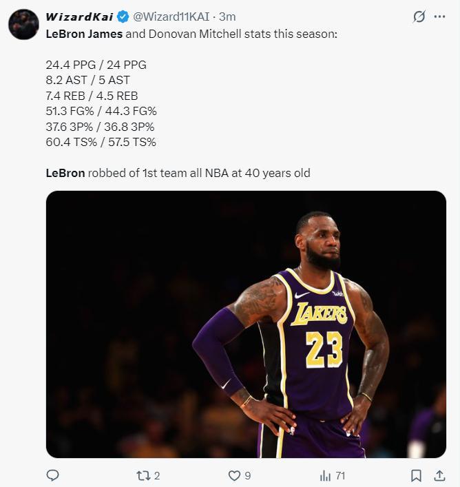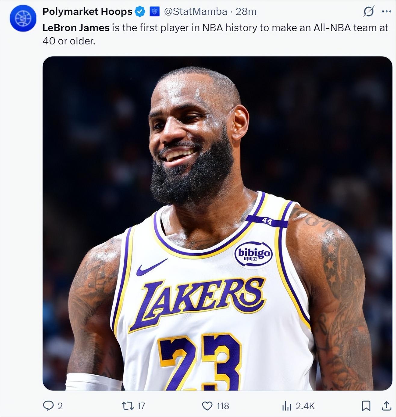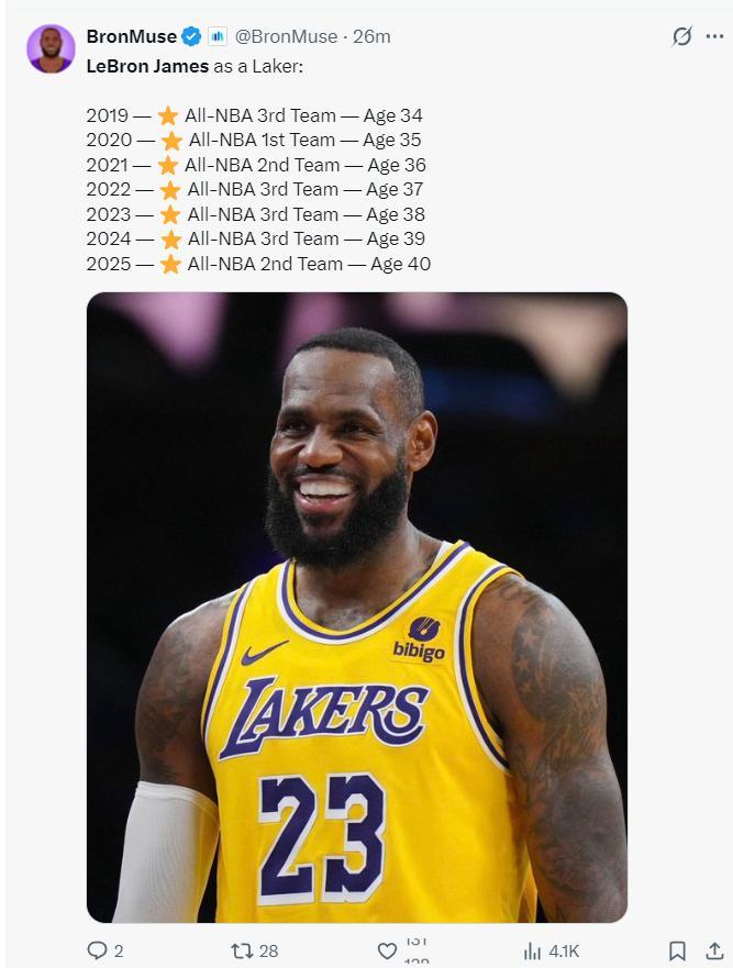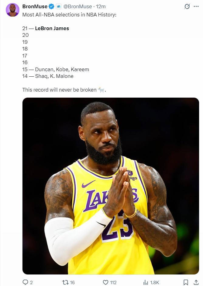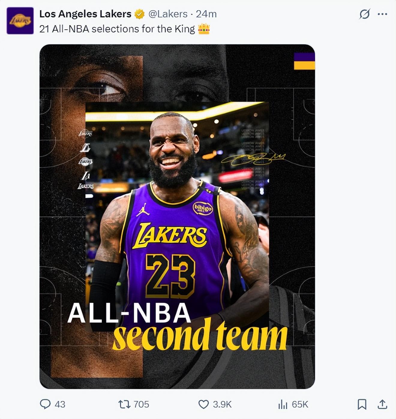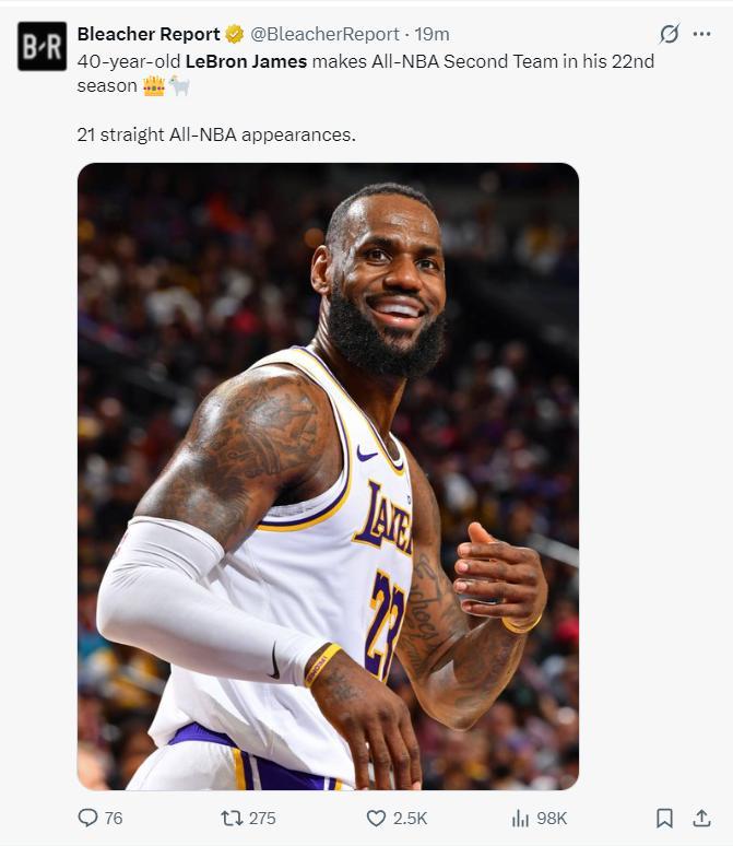 換言之40歲高齡的勒布朗-詹姆斯職業生涯第21次入選最佳陣容,湖人官方爲King祝賀。