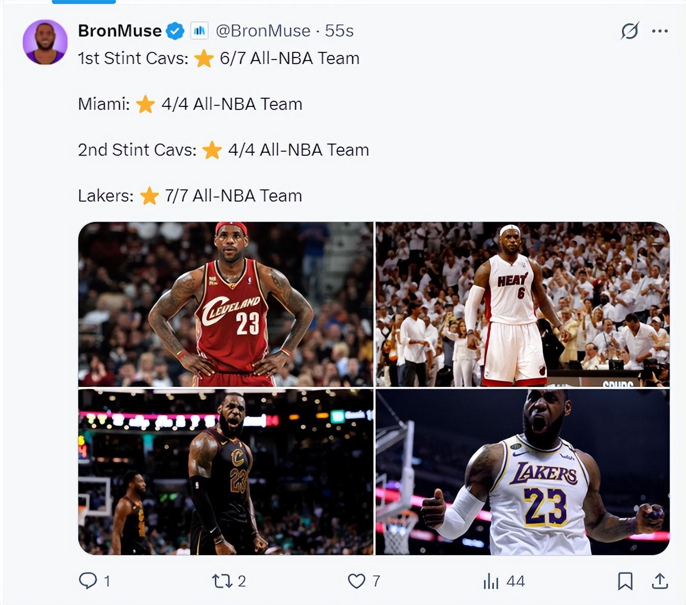 勒布朗騎士1.0生涯6次最佳陣容、熱火生涯4次、騎士2.0生涯4次、湖人生涯7次。