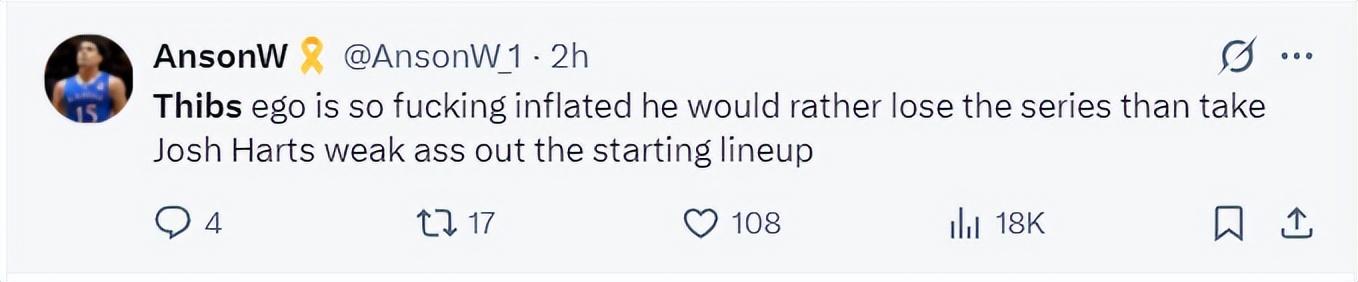 美球迷:錫伯杜自我膨脹到了極點,他寧願輸掉系列賽,也不願把哈特從首發陣容中去掉。