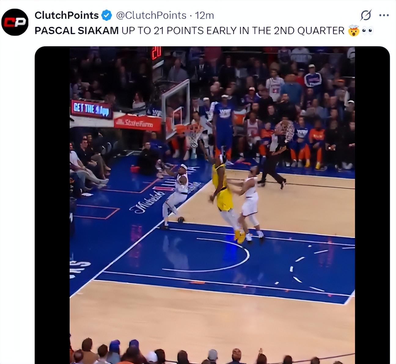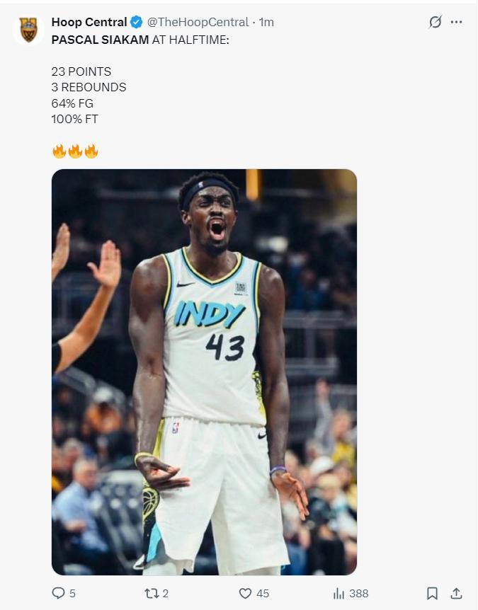 北京時間5月24日,NBA東部決賽G2,上半場打完尼克斯52-49領先步行者,哈利伯頓半場7中1,西卡半場23分3籃板1助攻支撐全隊得分佔比全隊46.9%。