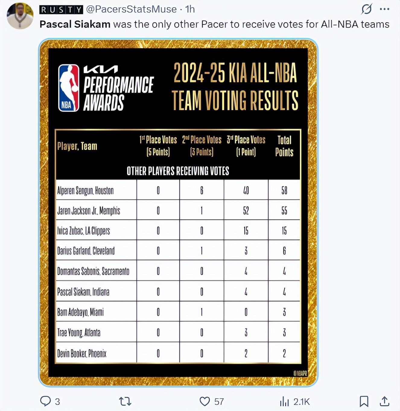 賽前NBA官方公佈了最佳陣容名單,步行者只有哈利伯頓入選了,而尼克斯有布倫森與唐斯兩人,步行者二當家西卡只獲得了4張第三選票獲得4分,他至少也有最佳陣容的投票。