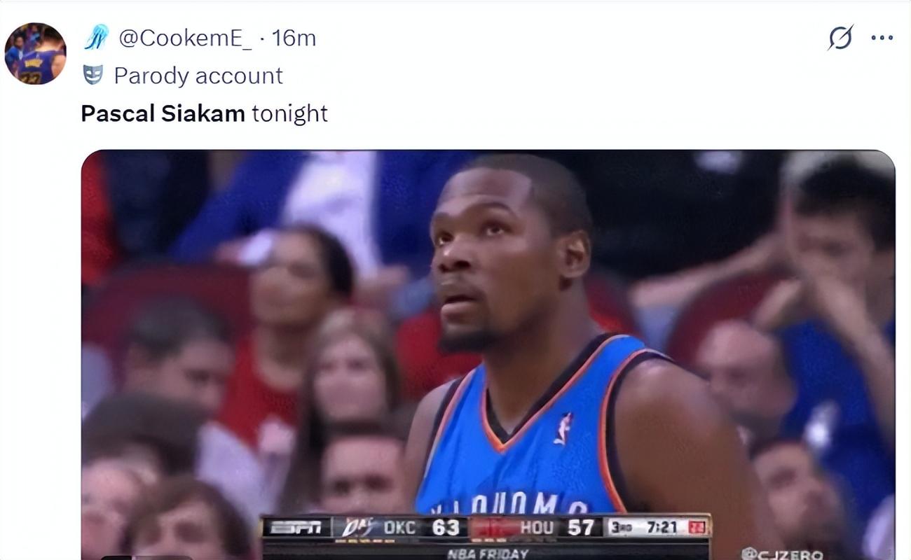 步行者球迷認爲這場比賽的西卡似乎是巔峯杜蘭特附體了,不僅僅是突破犀利就連中投都那麼準。