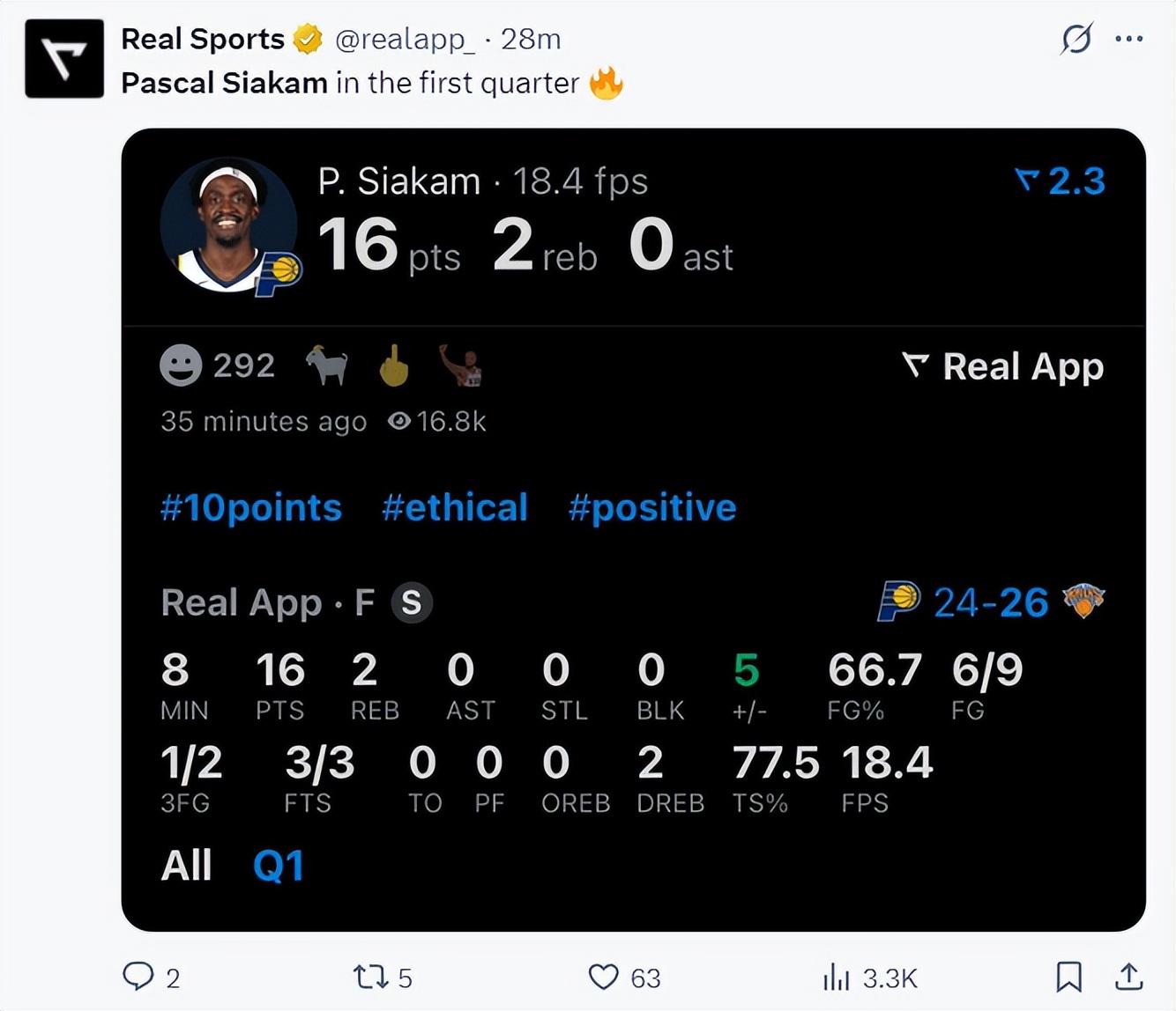 要知道步行者首節24分,西卡一人拿到16分得分佔比全隊66%,他太關鍵了。