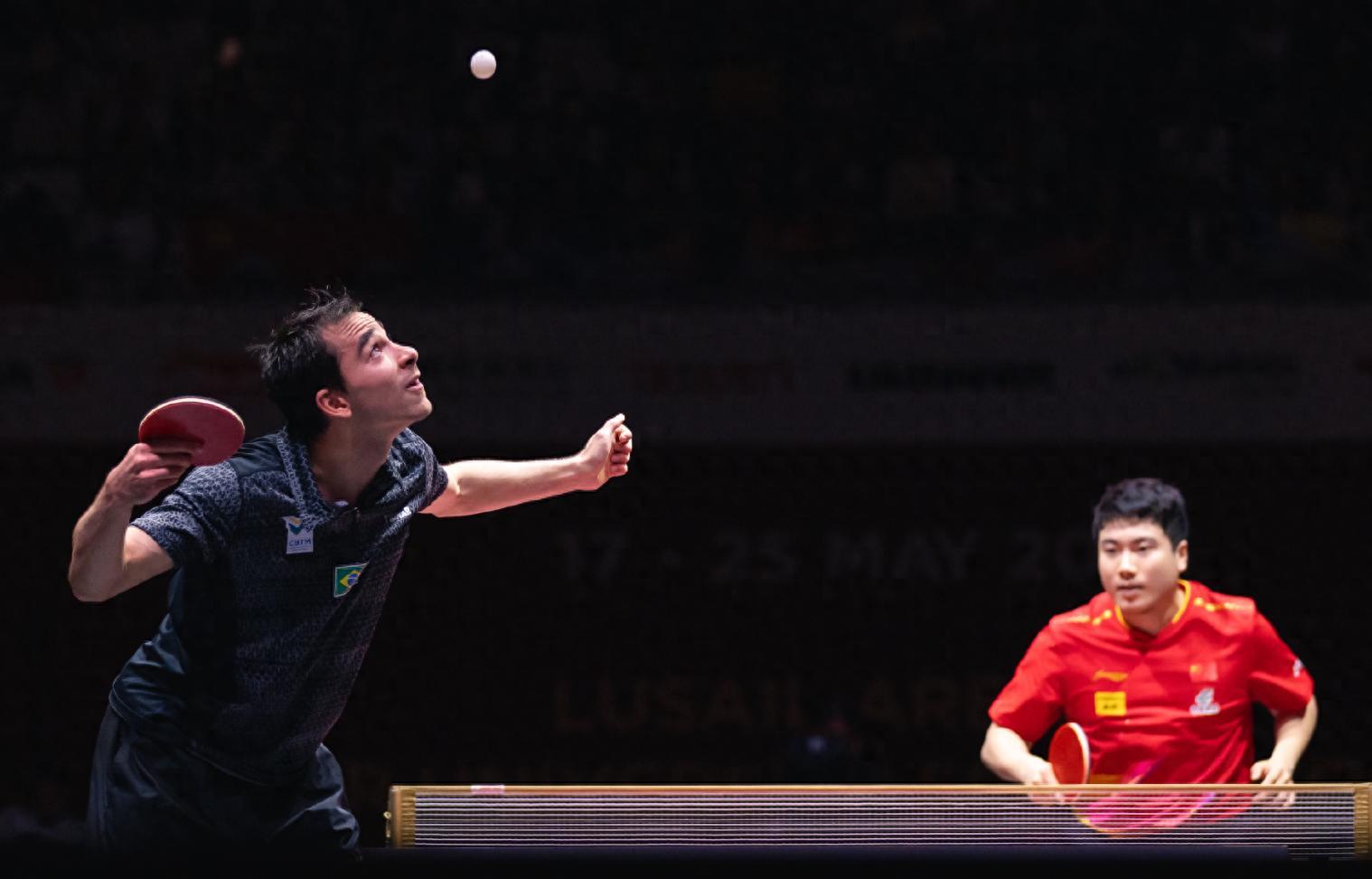 2025年多哈世乒賽男單半決賽,中國選手梁靖崑(世界排名第五)3-4惜敗巴西選手雨果(世界排名第三),七局比分:【13-15,7-11,11-8,8-11,11-3,11-7,9-11】 。這場比賽大胖打出了風采,打出了高度,他輸球還是獲得了讚譽。