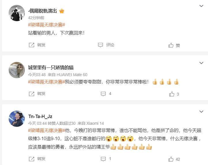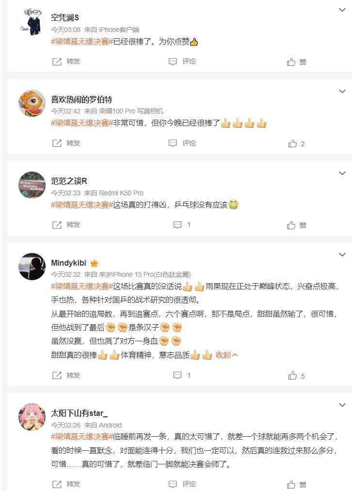 博主:真的看哭了,雨果與梁靖崑這場七局大戰太窒息,大胖咬牙拼到最後一刻,雖然3-4惜敗,但這場球真把血性打出來了。